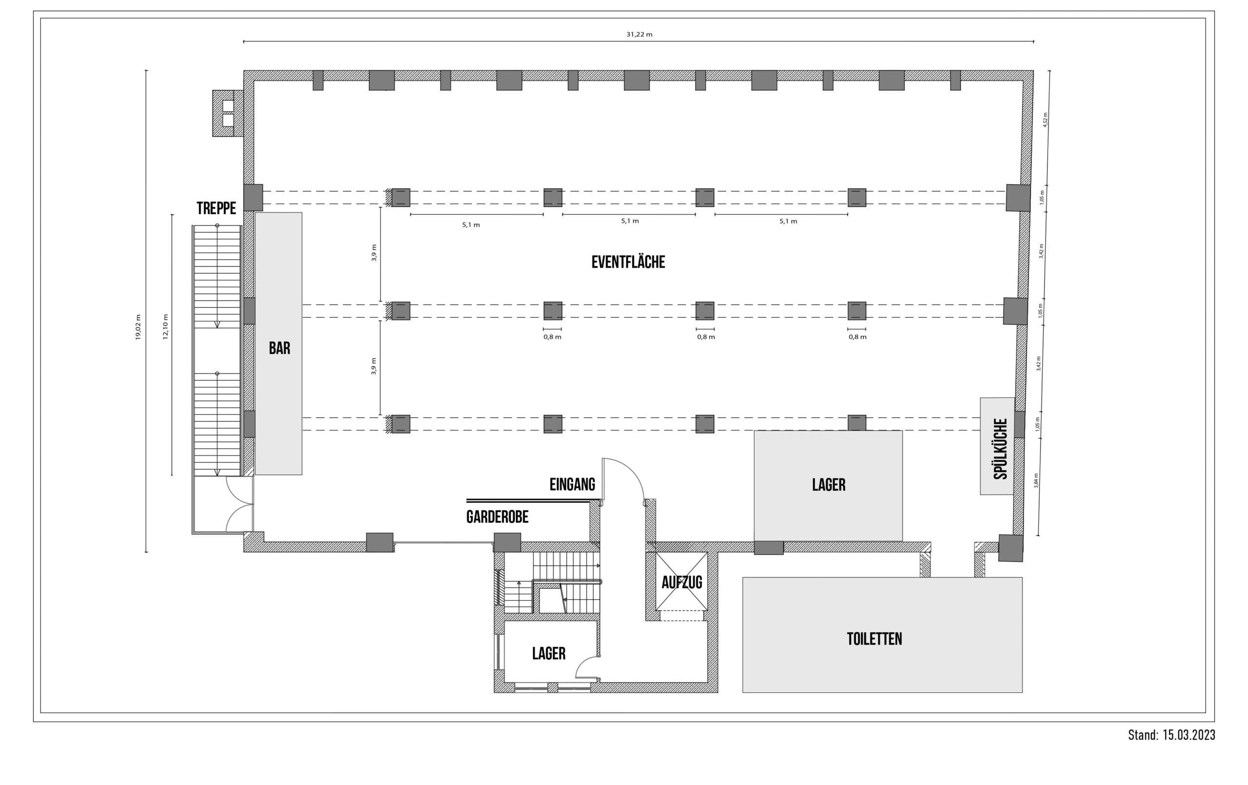 Der Lageplan des Espace vermittelt Ihnen einen umfassenden Überblick über Größe, Raumstruktur und Zugänge. So können Sie präzise einschätzen, wie sich dieser großzügige Veranstaltungsbereich optimal in Ihr Eventkonzept integrieren lässt – ob mit Bühne, Buffet, Lounge oder separatem Empfangsbereich.